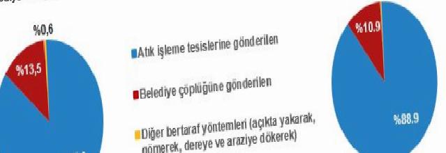 Toplam 1 401 belediyenin 1 392’sinde atık hizmeti verildiği tespit edildi. Atık hizmeti verilen belediyelerde toplanan 32,3 milyon ton atığın %88,9’u atık sürece tesislerine ve %10,9’u belediye çöplüklerine gönderilirken, %0,3’ü ise başka yollarla bertaraf edildi. Belediyelerde toplanan kişi başı günlük ortalama atık ölçüsü 1,09 kg olarak hesaplandı.