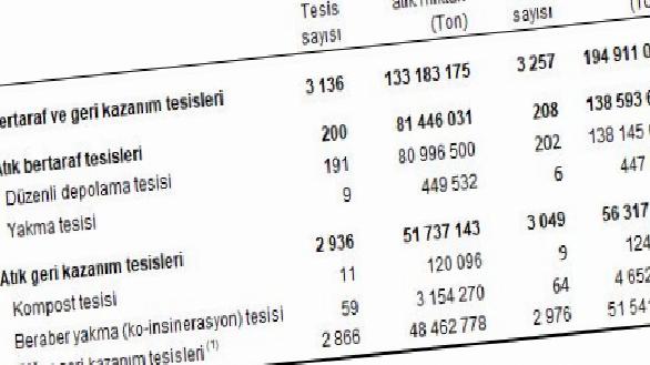 Atık bertaraf ve geri kazanım tesislerinde işlenen 195 milyon ton atığın 139 milyon tonu bertaraf edildi, 56 milyon tonu ise geri kazanıldı.