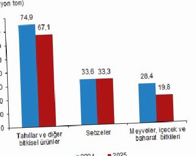 Üretim ölçülerinin, 2025 yılı ikinci iddiasında bir evvelki yıla nazaran tarla eserleri olan tahıllar ve başka bitkisel eserlerde (yem bitkileri hariç) %10,4, sebzelerde %0,8, meyveler, içecek ve baharat bitkilerinde %30,4 oranında azalacağı varsayım edildi. Buna nazaran, yaklaşık üretim ölçülerinin tahıllar ve öteki bitkisel eserlerde 67,1 milyon ton, sebzelerde 33,3 milyon ton, meyveler, içecek ve baharat bitkilerinde ise 19,8 milyon ton olarak gerçekleşeceği öngörüldü.