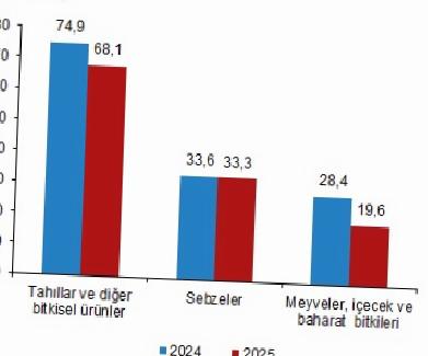 Üretim ölçüleri, 2025 yılında bir evvelki yıla nazaran tarla eserleri olan tahıllar ve öteki bitkisel eserlerde (yem bitkileri hariç) %9,0, sebzelerde %0,9, meyveler, içecek ve baharat bitkilerinde %30,9 oranında azaldı. Buna nazaran, yaklaşık üretim ölçüleri tahıllar ve başka bitkisel eserlerde 68,1 milyon ton, sebzelerde 33,3 milyon ton, meyveler, içecek ve baharat bitkilerinde ise 19,6 milyon ton olarak gerçekleşti.