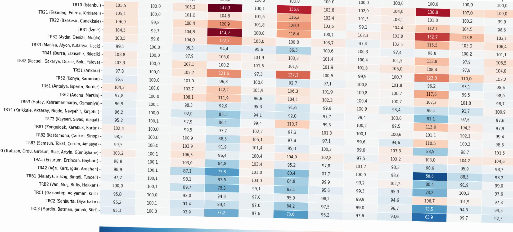 Türkiye’nin 2024 yılı sonuçlarına nazaran fiyat seviyesi endeksi en yüksek bölgesi 112,6 ile TR10 (İstanbul), en düşük bölgesi ise 91,5 ile TRC3 (Mardin, Batman, Şırnak, Siirt) oldu. Bu endeks bedelleri, TR10 (İstanbul)’un Türkiye ortalamasına nazaran %12,6 kıymetli, TRC3 (Mardin, Batman, Şırnak, Siirt)’ün ise %8,5 daha ucuz olduğunu göstermiştir.