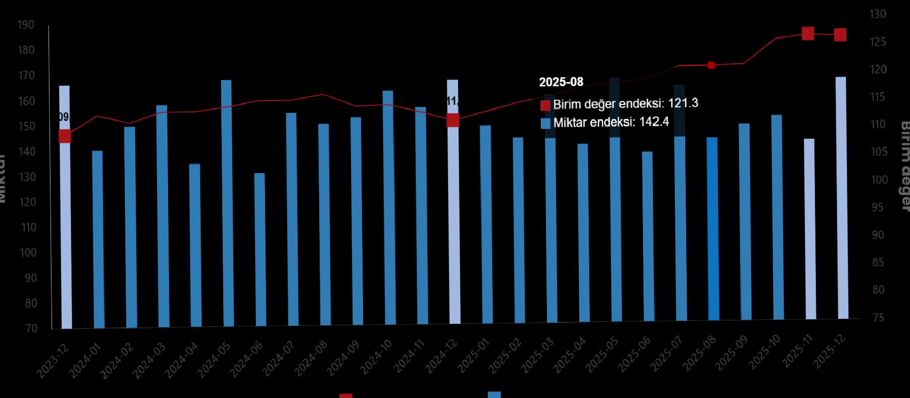 Mevsim ve takvim tesirlerinden arındırılmış seriye nazaran ihracat ölçü endeksi; 2025 Kasım ayında 143,3 iken 2025 Aralık ayında %2,8 oranında artarak 147,3 oldu. Takvim tesirlerinden arındırılmış seriye nazaran ise ihracat ölçü endeksi; 2024 yılı Aralık ayında 164,1 iken 2025 yılı Aralık ayında %4,3 oranında azalarak 157,0 oldu.