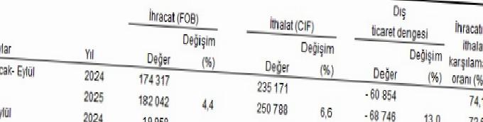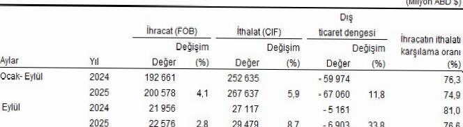 Ocak-Eylül devrinde dış ticaret açığı %11,8 artarak 59 milyar 974 milyon dolardan, 67 milyar 60 milyon dolara yükseldi. İhracatın ithalatı karşılama oranı 2024 Ocak-Eylül devrinde %76,3 iken, 2025 yılının birebir periyodunda %74,9’a geriledi.