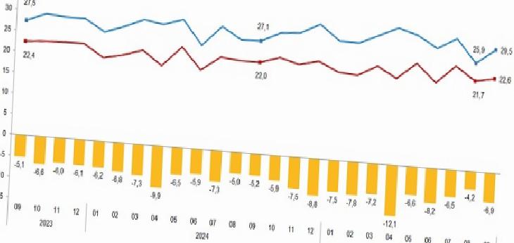 Eylül ayında dış ticaret açığı bir evvelki yılın birebir ayına nazaran %33,8 artarak 5 milyar 161 milyon dolardan, 6 milyar 903 milyon dolara yükseldi. İhracatın ithalatı karşılama oranı 2024 Eylül ayında %81,0 iken, 2025 Eylül ayında %76,6’ya geriledi.