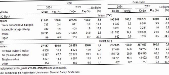 Türkiye İstatistik Kurumu ile Ticaret Bakanlığı iş birliğiyle genel ticaret sistemi kapsamında üretilen süreksiz dış ticaret bilgilerine nazaran; ihracat 2025 yılı Eylül ayında, bir evvelki yılın birebir ayına nazaran %2,8 artarak 22 milyar 576 milyon dolar, ithalat %8,7 artarak 29 milyar 479 milyon dolar olarak gerçekleşti.