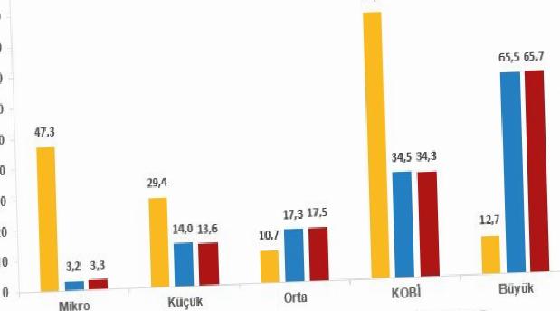 Dolaylı Ar-Ge teşviklerinden yararlanan teşebbüsler büyüklük kümelerine nazaran ele alındığında, 10 bin 569 teşebbüsün %87,3’ünün küçük ve orta büyüklükteki işletmeler (KOBİ) olduğu görüldü. Teşebbüs sayısı bakımından Ar-Ge teşviklerinden yararlanan büyük ölçekli teşebbüslerin hissesi %12,7 iken bu teşebbüsler dolaylı Ar-Ge teşviklerinin %65,7’sinden yararlandı.