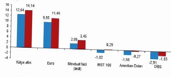 Yİ-ÜFE ile indirgendiğinde; yatırım araçlarından, mevduat faizi (brüt) %0,77 ve Devlet İç Borçlanma Senetleri (DİBS) %0,71 oranlarında yatırımcısına gerçek getiri sağlarken; külçe altın %0,33, Amerikan Doları %0,95 ve Euro %1,39 oranlarında yatırımcısına kaybettirdi. TÜFE ile indirgendiğinde ise mevduat faizi (brüt) %1,21, DİBS %1,15 ve külçe altın %0,10 oranlarında yatırımcısına gerçek getiri sağlarken; Amerikan Doları %0,52 ve Euro %0,96 oranlarında yatırımcısına kaybettirdi.