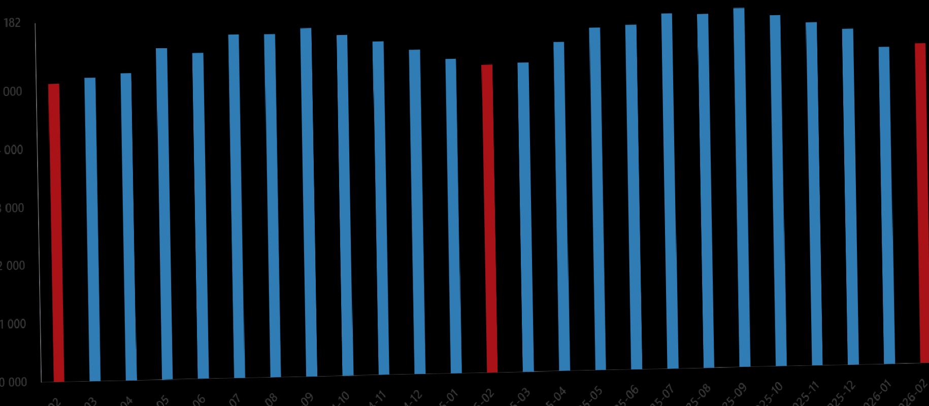 Sanayi, inşaat ve ticaret-hizmet dalları toplamında fiyatlı çalışan sayısı 2026 Şubat ayında bir evvelki aya nazaran %0,4 arttı.