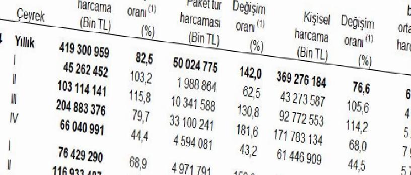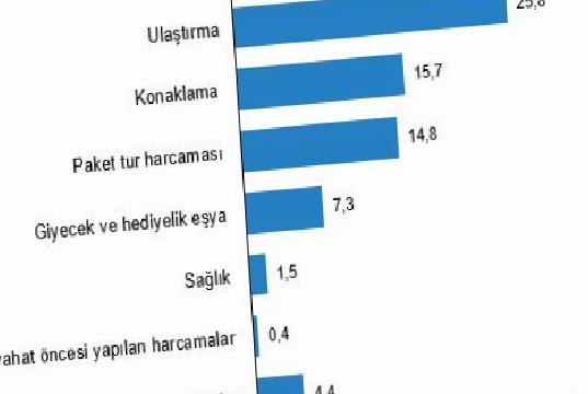 Bu çeyrekte harcama çeşitlerinin toplam seyahat harcamaları içinde dağılım oranları incelendiğinde en fazla hisseye %30,1 ile yeme ve içme harcamaları, %25,8 ile ulaştırma harcamaları ve %15,7 ile konaklama harcamaları sahip oldu. Bu harcama cinslerinin geçen yılın birebir periyoduna nazaran değişim oranları incelendiğinde ise yeme ve içme harcamalarında %3,1, ulaştırma harcamalarında %7,1 ve konaklama harcamalarında ise %26,2’lik artış görüldü.