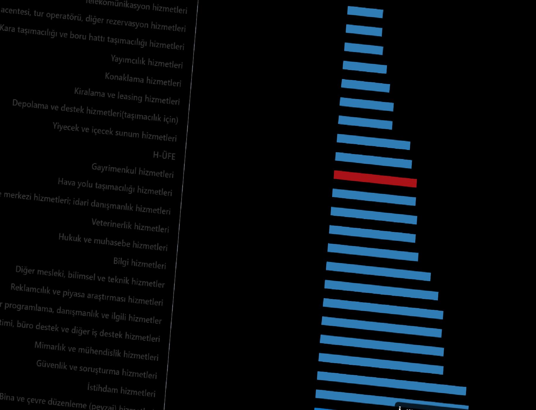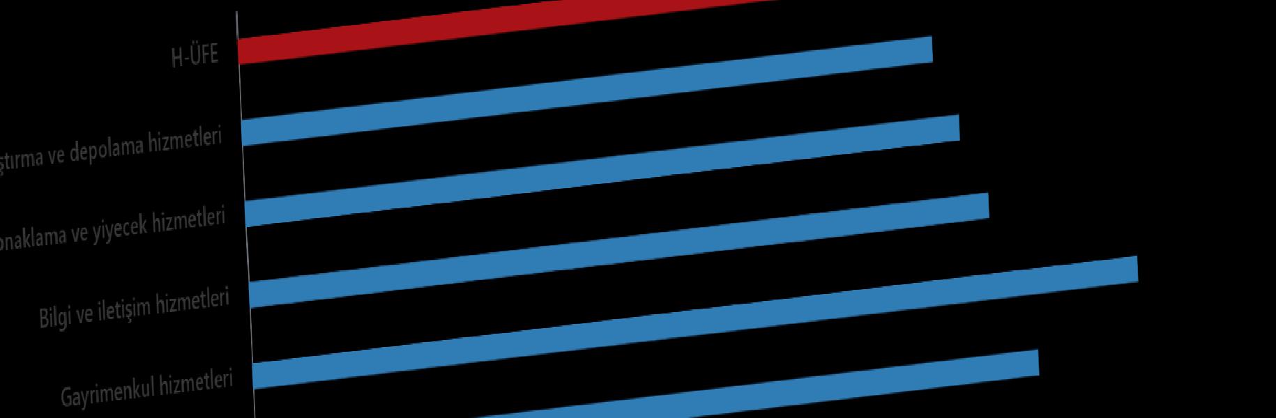 Bir evvelki yılın birebir ayına nazaran, ulaştırma ve depolama hizmetlerinde %32,73 artış, konaklama ve yiyecek hizmetlerinde %33,85 artış, bilgi ve irtibat hizmetlerinde %35,06 artış, gayrimenkul hizmetlerinde %41,94 artış, mesleksel, bilimsel ve teknik hizmetlerde %37,06 artış, idari ve takviye hizmetlerde %32,07 artış gerçekleşti.