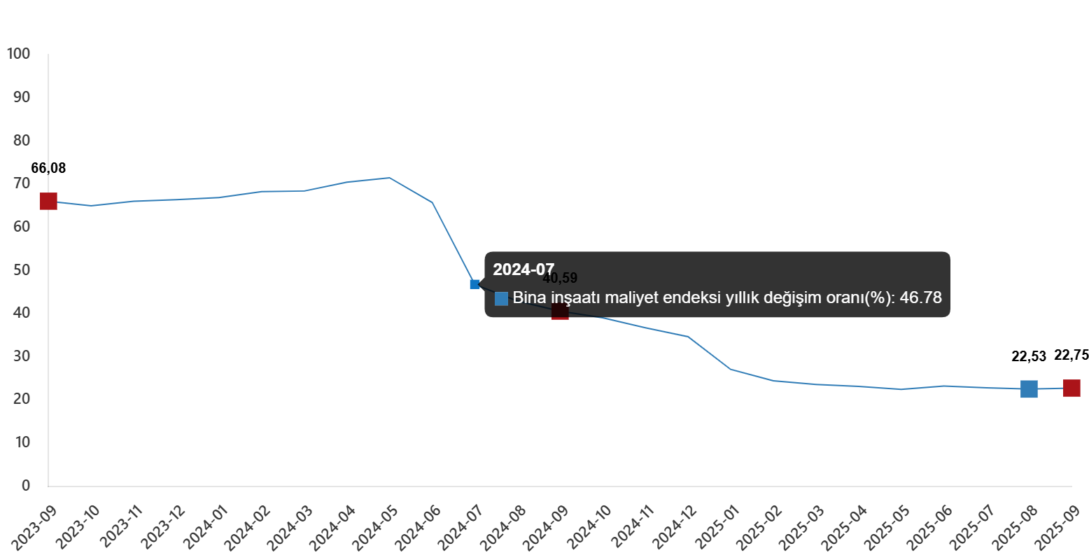Bina inşaatı maliyet endeksi yıllık değişim oranı(%), Eylül 2025