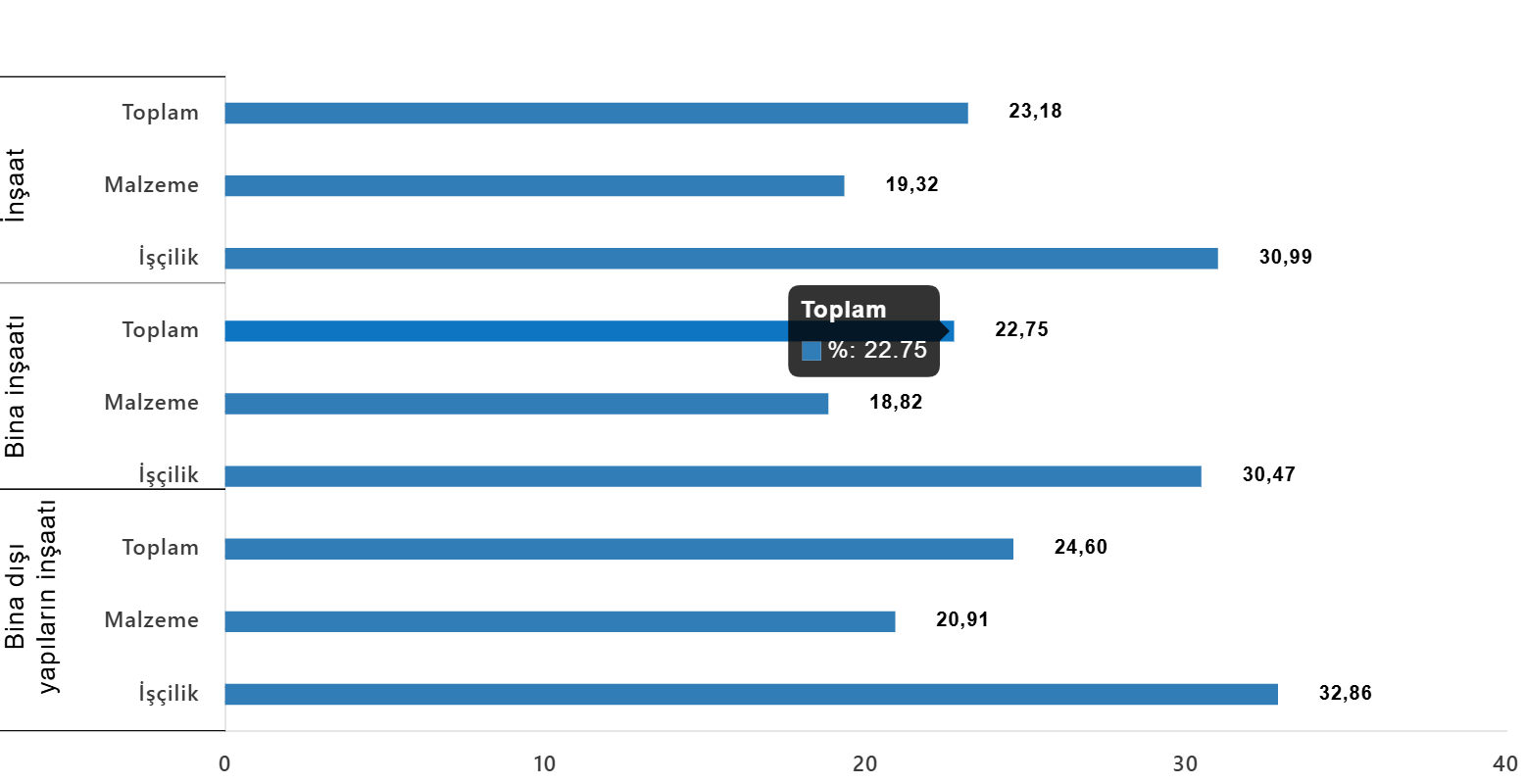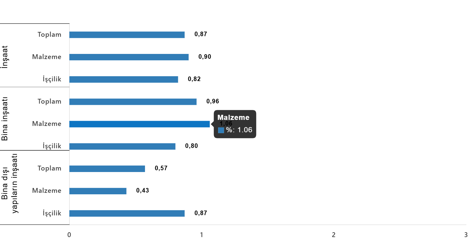 Bina inşaatı maliyet endeksi, bir evvelki aya nazaran %0,96 arttı, bir evvelki yılın tıpkı ayına nazaran %22,75 arttı. Bir evvelki aya nazaran gereç endeksi %1,06 arttı, personellik endeksi %0,80 arttı. Ayrıyeten bir evvelki yılın birebir ayına nazaran materyal endeksi %18,82 arttı, personellik endeksi %30,47 arttı.