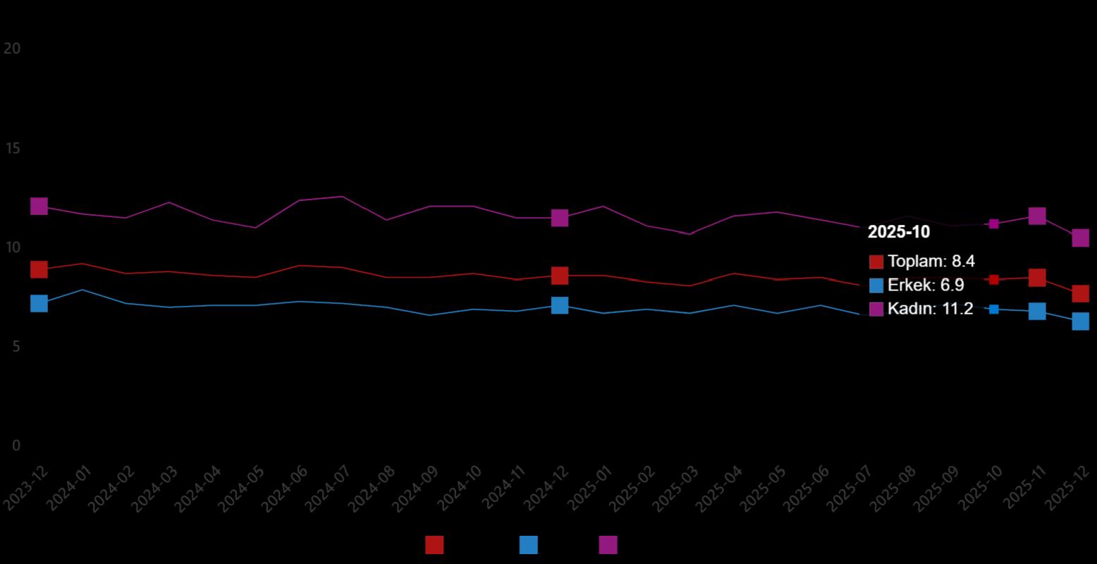Hanehalkı İşgücü Araştırması sonuçlarına nazaran; 15 ve daha üst yaştaki şahıslarda işsiz sayısı 2025 yılı Aralık ayında bir evvelki aya nazaran 286 bin kişi azalarak 2 milyon 736 bin kişi oldu. İşsizlik oranı ise 0,8 puan azalarak %7,7 düzeyinde gerçekleşti. İşsizlik oranı erkeklerde %6,3 iken bayanlarda %10,5 olarak iddia edildi.