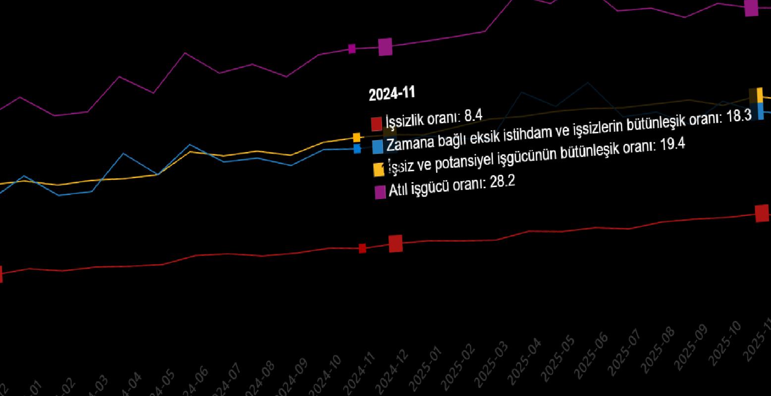 Zamana bağlı eksik istihdam, potansiyel işgücü ve işsizlerden oluşan atıl işgücü oranı 2025 yılı Aralık ayında bir evvelki aya nazaran 0,3 puan azalarak %28,6 oldu. Vakte bağlı eksik istihdam ve işsizlerin bütünleşik oranı %18,1 iken işsiz ve potansiyel işgücünün bütünleşik oranı %19,5 olarak kestirim edildi.