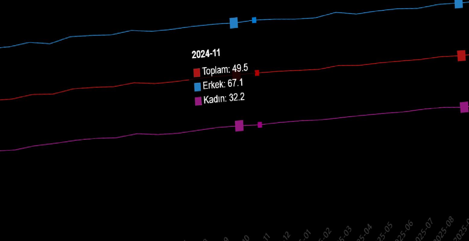 İşgücü, 2025 yılı Ekim ayında bir evvelki aya nazaran 157 bin kişi artarak 35 milyon 804 bin kişi, işgücüne katılma oranı ise 0,2 puan artarak %53,8 olarak gerçekleşti. İşgücüne katılma oranı erkeklerde %71,5 iken bayanlarda %36,5 oldu.