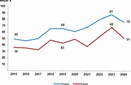 KOBİ’lerin 2015 yılında 49 milyar dolar olan ihracat kıymeti 2024 yılında 76 milyar dolara yükseldi. İthalatta ise 2015 yılında 36 milyar dolar olan paha, 2024 yılında 51 milyar dolara yükseldi.