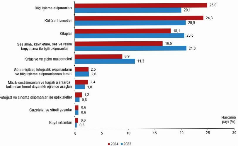 Hanehalklarının kültür harcamaları, 2024 yılında evvelki yıla nazaran %91,5 artarak 203 milyar 807 milyon 948 bin TL oldu. Hanehalklarının 2024 yılında gerçekleştirdiği kültür harcamalarında; bilgi sürece ekipmanları %25,0, kültürel hizmetler %24,3 ve kitaplar %18,1 hisseye sahip oldu.