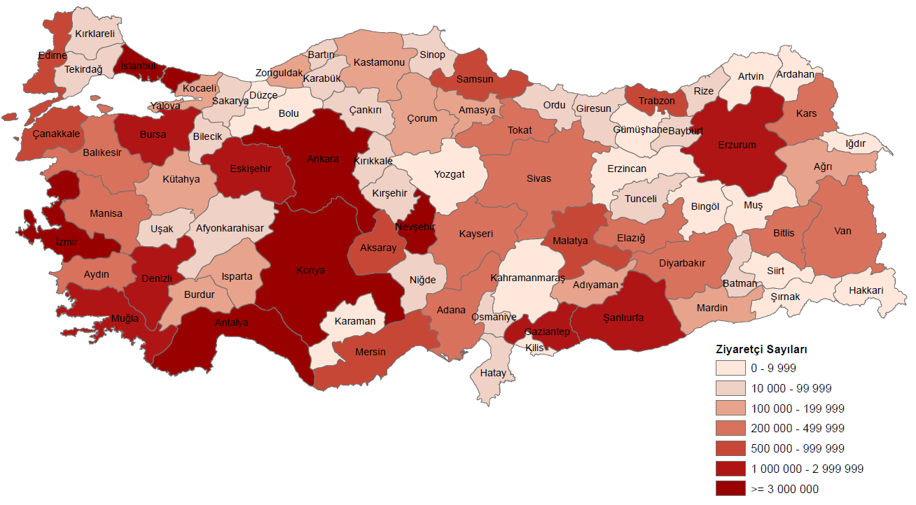 En yüksek müze ziyaretçi sayıları; 18 milyon 182 bin 745 ile İstanbul, 4 milyon 698 bin 641 ile İzmir ve 4 milyon 451 bin 607 ile Nevşehir vilayetlerinde gerçekleşti.