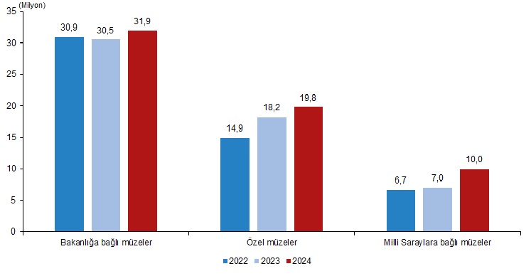 Müze ve ören yeri ziyaretçi sayısı, 2024 yılında %10,6 artarak 61 milyon 687 bin 726 oldu. Ziyaretçilerin %51,7’si Bakanlığa bağlı müze ve ören yerlerini ziyaret etti. Bakanlığa bağlı fiyatlı müze ve ören yerlerini ziyaret edenlerin sayısı 18 milyon 995 bin 286 ve toplam ziyaretçiler içindeki hissesi %30,8 oldu. Özel müze ziyaretçi sayısı %8,4 artarak 19 milyon 774 bin 549 olurken Ulusal Saraylar Başkanlığına bağlı müze ziyaretçi sayısı %42,3 artarak 9 milyon 999 bin 370 oldu.