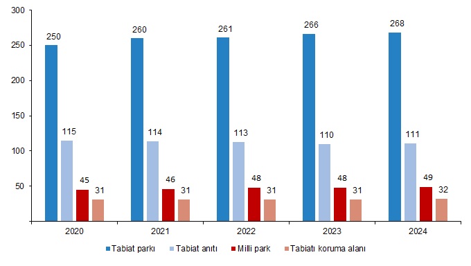 Milli parkların sayısı 2024 yılında bir evvelki yıla nazaran %2,1 artarak 49 oldu, ulusal park alanı %0,4 artarak 913 bin 160 oldu. Tabiat parkı sayısı %0,8 artarak 268’e yükselirken, tabiat parkı alanı %12,9 azalarak 94 bin 88 hektar oldu. Tabiatı müdafaa alanı sayısı evvelki yıla nazaran %3,2 artarak 32 olurken, tabiat anıtı sayısı %0,9 artarak 111 oldu.