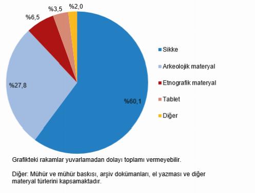 Müzelerdeki eser sayısı evvelki yıla nazaran %2,4 artarak 3 milyon 995 bin 133 oldu. Bakanlığa bağlı müzelerdeki eser sayısı geçen yıla nazaran %0,9 artarak 3 milyon 370 bin 881 olurken özel müzelerdeki eser sayısı %1,7 artarak 291 bin 89, Ulusal Saraylar Başkanlığına bağlı müzelerdeki eser sayısı %22,1 artarak 333 bin 163 oldu. Bakanlığa bağlı müzelerdeki yapıtların %60,1’i sikke, %27,8’i arkeolojik gereç, %6,5’i etnografik gereç, %3,5’i tablet oldu.
