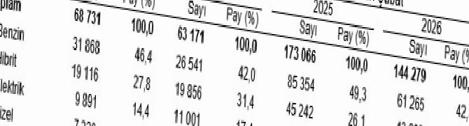 Trafiğe kaydı yapılan arabaların yakıt cinslerine nazaran dağılımı, Şubat 2026
