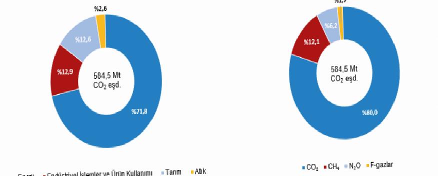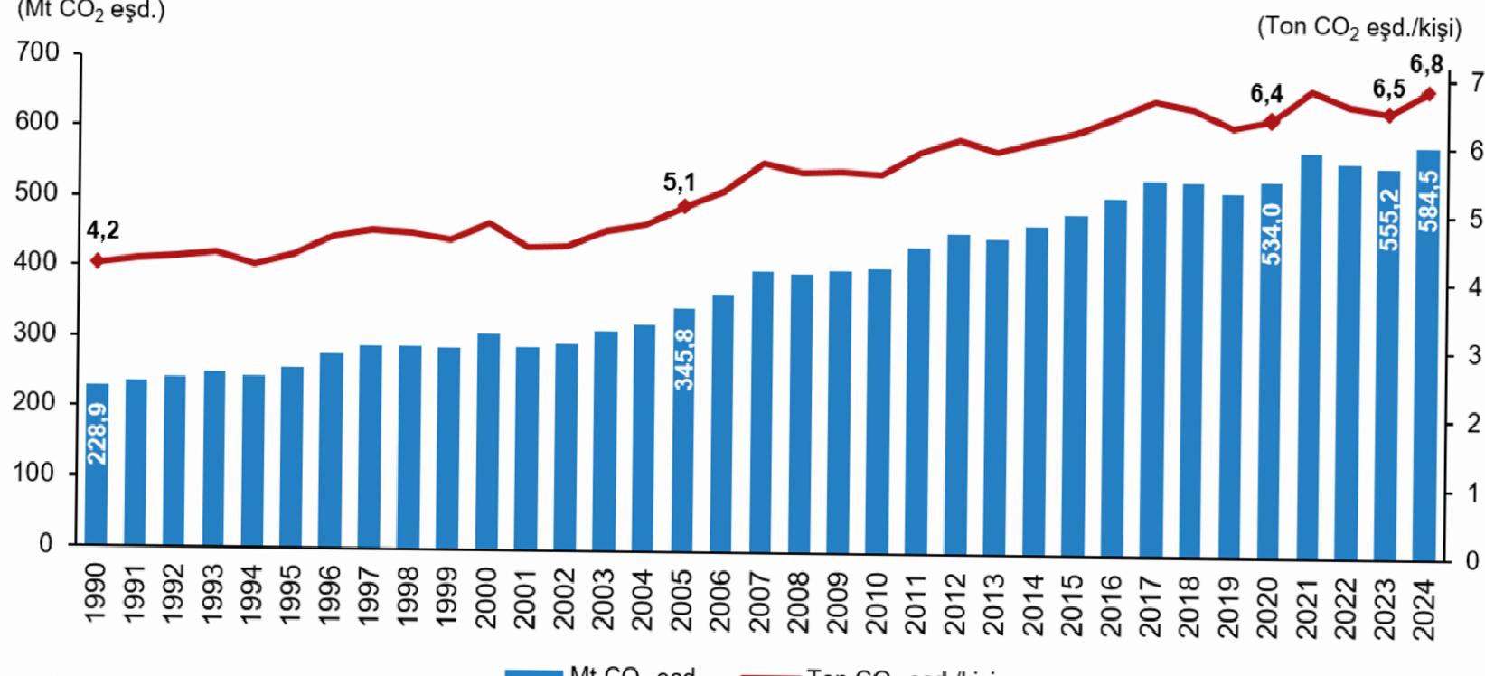 Sera gazı envanteri sonuçlarına nazaran, 2024 yılı toplam sera gazı emisyonu bir evvelki yıla nazaran %5,3 artarak 584,5 milyon ton (Mt) CO2 eşdeğeri (eşd.) olarak hesaplandı. Kişi başı toplam sera gazı emisyonu 1990 yılında 4,2 ton CO2 eşd., 2023 yılında 6,5 ton CO2 eşd. ve 2024 yılında 6,8 ton CO2 eşd. olarak hesaplandı.