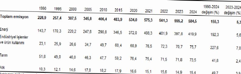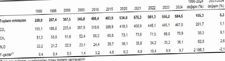 Toplam sera gazı emisyonu 2024 yılında 584,5 Mt CO2 eşdeğeri oldu