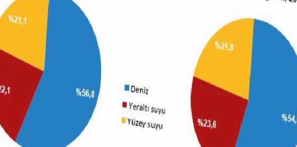 2024 yılında çekilen suyun %54,6’sı denizden; %23,6’sı yeraltı ve %21,8’i yüzey suları olmak üzere toplam %45,4’ü tatlı su kaynaklarından temin edildi. Denizden çekilen suyun yüzde %93,8’i soğutma gayeli temin edildi.