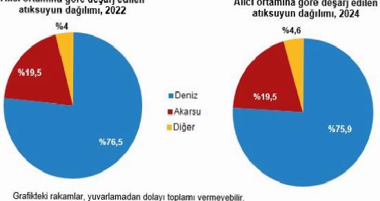 Belediyeler, imalat sanayi işyerleri, termik santraller, OSB müdürlükleri, maden işletmeleri ve köyler tarafından 2024 yılında direkt alıcı ortamlara toplam 17,2 milyar m3 atıksu deşarj edildi. Direkt alıcı ortamlara deşarj edilen atıksuyun %75,9’u denizlere, %19,5’i akarsulara, %1,1’i barajlara, %0,8’i foseptiklere, %0,6’sı göl/göletlere, %0,2’si yere, %1,9’u ise öbür alıcı ortamlara deşarj edildi. Denize deşarj edilen atıksuyun yüzde % 80,1’i soğutma suyundan oluştu.