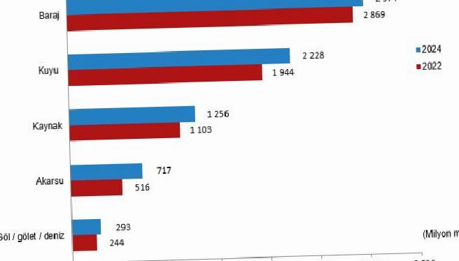 Araştırma kapsamındaki belediyeler, imalat sanayi işyerleri, termik santraller, OSB müdürlükleri, maden işletmeleri ve köyler tarafından 2022 yılında su kaynaklarından toplam 19,2 milyar m3 su çekilirken, 2024 yılında ise toplam 20,3 milyar m3 su çekildi.