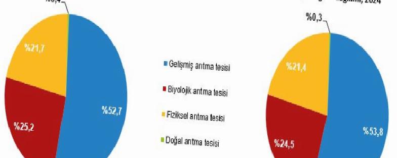 Kanalizasyon şebekesinden deşarj edilen 5,8 milyar m3 atıksuyun 4,9 milyar m3’ü atıksu arıtma tesislerinde arıtıldı. Arıtılan atıksuyun %53,8’ine gelişmiş, %24,5’ine biyolojik, %21,4’üne fizikî ve %0,3’üne doğal arıtma uygulandı.
