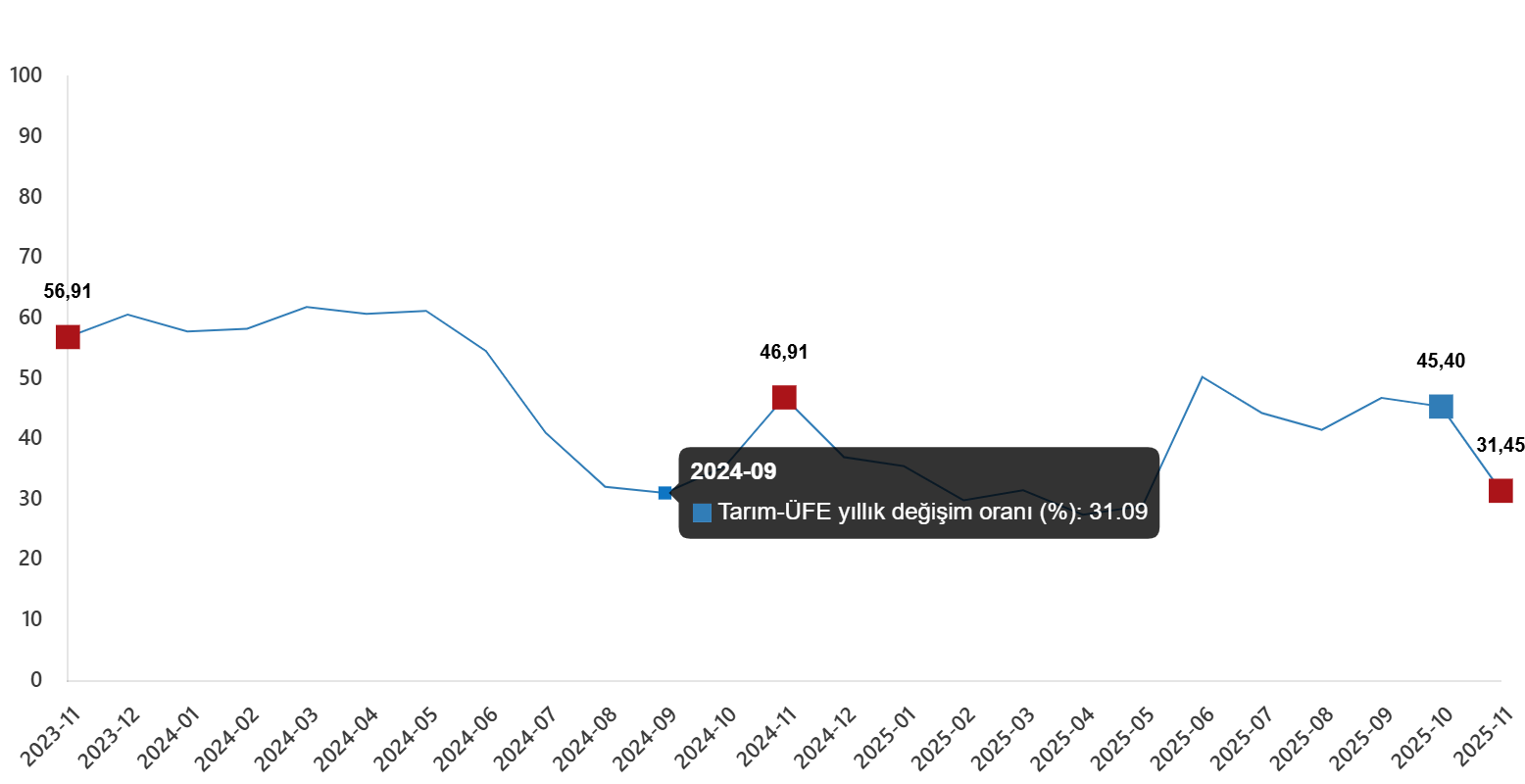 Tarım-ÜFE’de (2020=100), 2025 yılı Kasım ayında bir evvelki aya nazaran %1,56 azalış, bir evvelki yılın Aralık ayına nazaran %31,97 artış, bir evvelki yılın tıpkı ayına nazaran %31,45 artış ve on iki aylık ortalamalara nazaran %37,58 artış gerçekleşti.