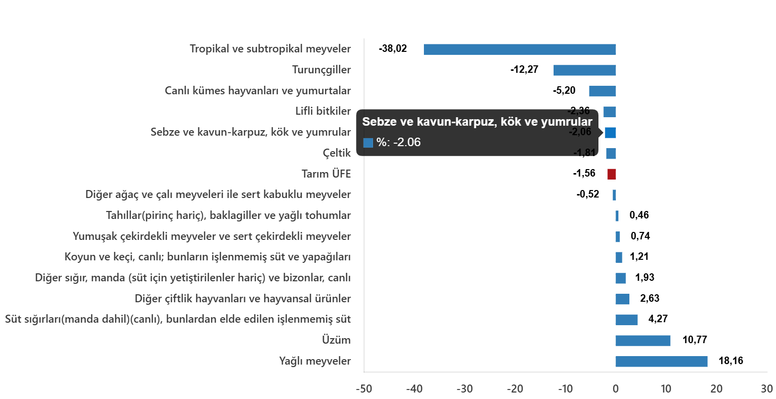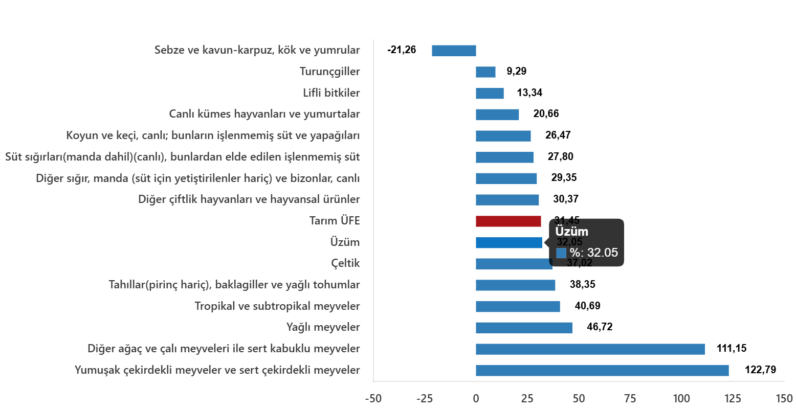 Tarım eserleri üretici fiyat endeksi (Tarım-ÜFE) yıllık %31,45 arttı, aylık %1,56 azaldı