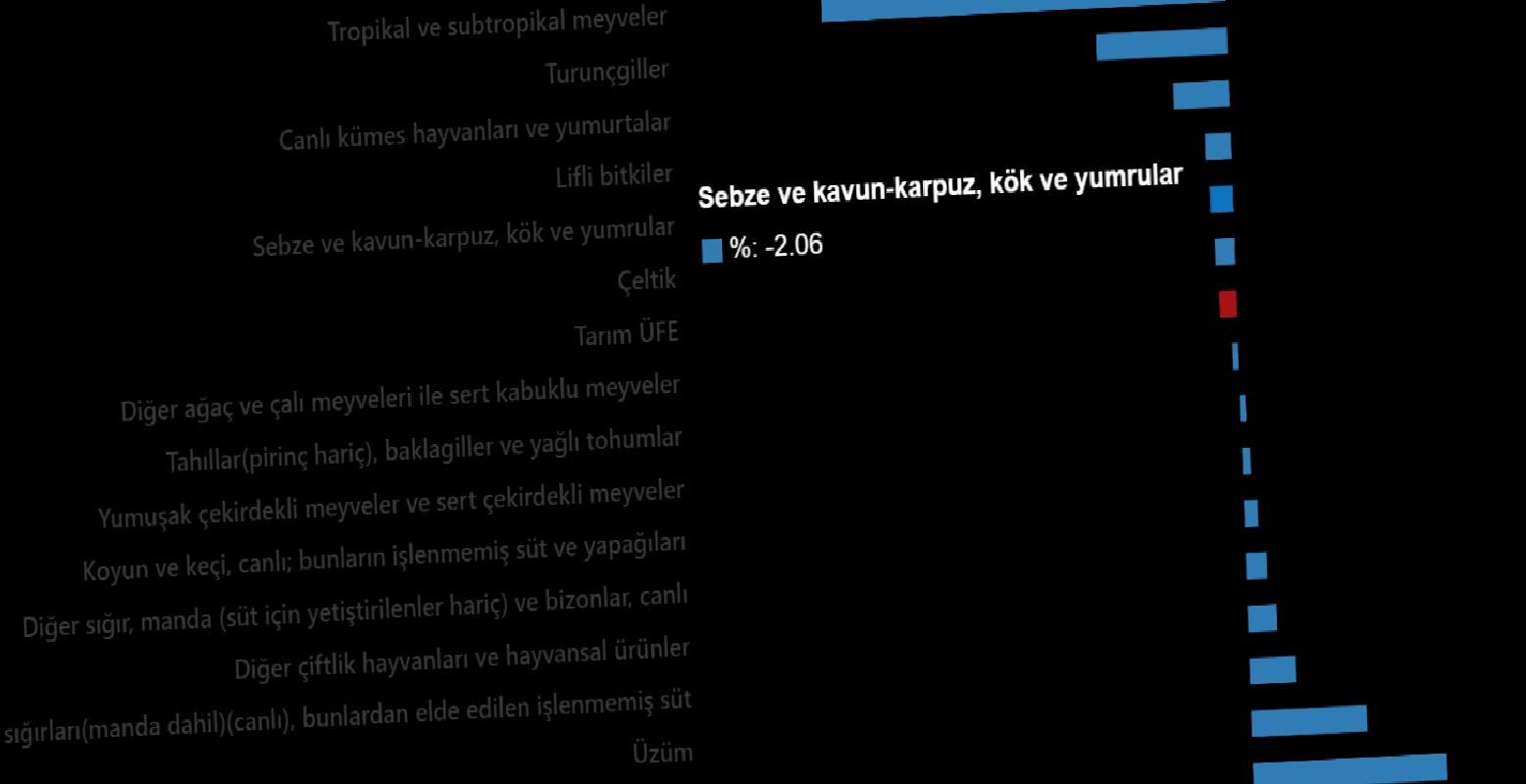 Sektörlerde bir evvelki aya nazaran, tarım ve avcılık eserleri ve ilgili hizmetlerde %1,75 azalış, ormancılık eserleri ve ilgili hizmetlerde %1,66 artış ve balık ve öteki balıkçılık eserleri; su eserleri; balıkçılık için destekleyici hizmetlerde %1,07 artış gerçekleşti. Ana kümelerde bir evvelki aya nazaran, tek yıllık (uzun ömürlü olmayan) bitkisel eserlerde %0,69 azalış, çok yıllık (uzun ömürlü) bitkisel eserlerde %0,03 azalış ve canlı hayvanlar ve hayvansal eserlerde %2,17 artış gerçekleşti.