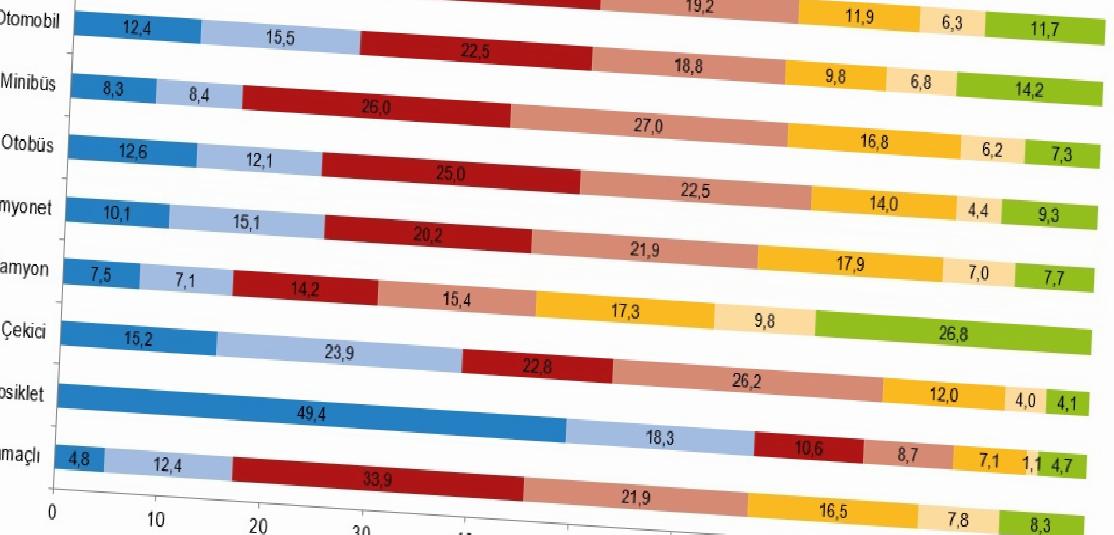 Türkiye’de 2024 yılında katedilen toplam uzaklık taşıtların yaş kümelerine nazaran incelendiğinde; en fazla yol %20,5’lik oranla taşıt filosunun %16,8’ini oluşturan 5-9 yaş kümesi taşıtlar tarafından yapılırken, bunu sırasıyla %19,2 ile 10-14 yaş, %15,6 ile 2-4 yaş, %15,0 ile 0-1 yaş, %11,9 ile 15-19 yaş, %11,7 ile 25 yaş ve üzeri ve %6,3 ile 20-24 yaş kümesi taşıtlar takip etti. Bu oran arabalarda 5-9 yaş arabalar için %22,5, 10-14 yaş için %18,8, 2-4 yaş için %15,5, 25 yaş ve üzeri için %14,2, 0-1 yaş için %12,4, 15-19 yaş için %9,8 ve 20-24 yaş için ise %6,8 oldu.