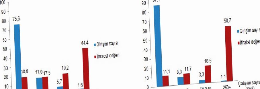 Toplam ithalatın %11,1’ini 1-9 kişi çalışanı olan mikro ölçekli teşebbüsler yaptı. İthalatta, 10-49 kişi çalışanı olan küçük ölçekli teşebbüslerin hissesi %11,7, 50-249 kişi çalışanı olan orta ölçekli teşebbüslerin hissesi %18,5 oldu. 250+ kişi çalışanı olan büyük ölçekli teşebbüslerin ithalattaki hissesi %58,7 olurken; bu teşebbüsler toplam ithalat yapan teşebbüslerin %1,1’ini oluşturdu.