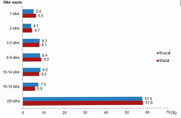 Girişimlerin %37,7’si tek ülkeye ihracat yaparken, %16,2’si iki ülkeye ihracat yaptı. Yirmi ve daha fazla ülkeye ihracat yapan teşebbüslerin oranı %3,1 iken, bu teşebbüslerin ihracattaki hissesi %57,6 oldu.