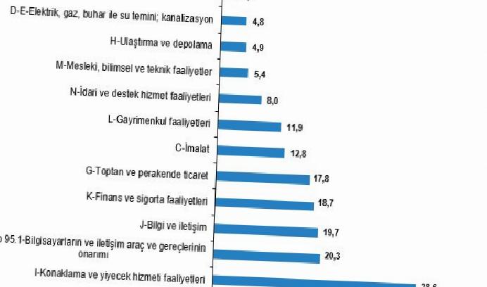 E-satış yapma oranı ekonomik faaliyet kümesine nazaran incelendiğinde ise 2024 yılında en fazla e-satış yapma oranının %38,6 ile “konaklama ve yiyecek hizmeti” faaliyetlerini yürüten teşebbüslerde olduğu görüldü. Bunu, %20,3 ile “bilgisayarların ve irtibat araç ve gereçlerinin onarımı” faaliyetlerini yürüten teşebbüsler ve %19,7 ile “bilgi ve iletişim” faaliyetlerini yürüten teşebbüsler takip etti.