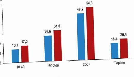 Enerji tüketimini azaltmak hedefiyle bilgi ve irtibat teknolojileri sistemleri yahut tahlilleri kullanan 10 ve daha fazla çalışanı olan teşebbüslerin oranı, 2025 yılında %17,1 oldu. Bu oran çalışan sayısı büyüklük kümesine nazaran incelendiğinde; 10-49 çalışanı olan teşebbüslerin %15,0’ının, 50-249 çalışanı olan teşebbüslerin %24,3’ünün ve 250 ve üzeri çalışanı olan teşebbüslerin %45,0’ının güç verimliliği için bilgi ve bağlantı teknolojileri sistemleri yahut tahlilleri kullandığı görüldü.