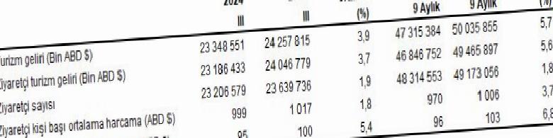 Turizm geliri Temmuz, Ağustos ve Eylül aylarından oluşan III. çeyrekte bir evvelki yılın tıpkı çeyreğine nazaran %3,9 artarak 24 milyar 257 milyon 815 bin dolar oldu. Ziyaretçilerden elde edilen turizm geliri 24 milyar 46 milyon 779 bin dolar, transfer yolculardan elde edilen turizm geliri ise 211 milyon 37 bin dolar oldu. Ziyaretçilerin turizm gelirinin %16,1’ini ülkemizi ziyaret eden yurt dışı ikametli vatandaşlar oluşturdu.