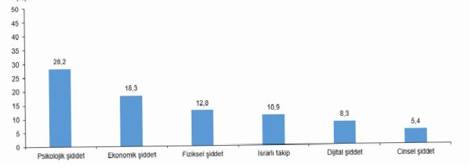 Son 12 ayda bayanların %11,6’sı ruhsal şiddete, %3,7’si dijital şiddete, %3,2’si ekonomik şiddete, %3,1’i ısrarlı takibe, %2,6’sı fizikî şiddete, %0,9’u cinsel şiddete maruz kaldı. Şiddet çeşitleri ortasında birinci sırayı ruhsal şiddet alırken ikinci sırayı dijital şiddet aldı.
