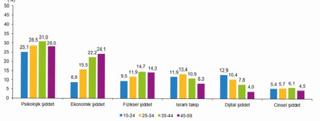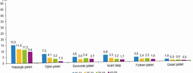 Tüm şiddet çeşitleri yaş kümesine nazaran incelendiğinde, son 12 ayda en yüksek oranda şiddete 15-24 yaş kümesindeki bayanlar maruz kaldı. Son 12 ayda ruhsal şiddet %15,2 ile en çok 15-24 yaş kümesindeki bayanlarda; en az %9,4 ile 45-59 yaş kümesindeki bayanlarda görüldü.
