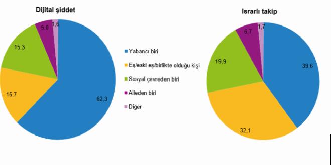 Yaşamının rastgele bir periyodunda şiddete maruz kalmış bayanlar, şiddeti uygulayan bireylere nazaran incelendiğinde, dijital şiddette yabancı biri %62,3 ile birinci sıradayken, eş/eski eş/birlikte olduğu kişi %15,7 ile ikinci sırada yer aldı. Israrlı takipte ise birinci sırayı %39,6 ile yabancı biri alırken, ikinci sırayı %32,1 ile eş/eski eş/birlikte olduğu kişi aldı.