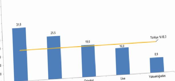 Yaşamının rastgele bir devrinde ekonomik şiddete maruz kalan bayanlar tamamlanan eğitim durumuna nazaran incelendiğinde, bir okul bitirmeyen bayanlar %31,8 ile birinci sırada yer alırken, yükseköğretimi tamamlayan bayanlar ise %8,9 ile son sırada yer aldı.