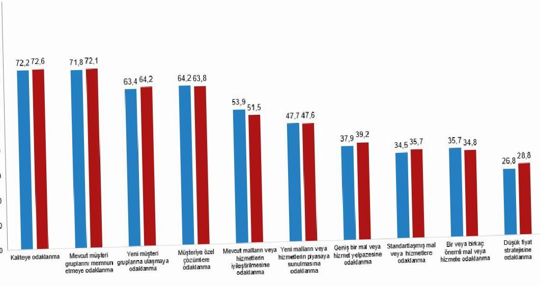 2022-2024 devrinde yenilik faaliyetinde bulunan teşebbüslerin ekonomik performansını etkileyen stratejiler ehemmiyet derecesi açısından incelendi. Teşebbüslerin %72,6’sı kaliteye, %72,1’i mevcut müşteri kümelerini mutlu etmeye ve %64,2’si yeni müşteri kümelerine ulaşma stratejilerine çok ehemmiyet verdi.