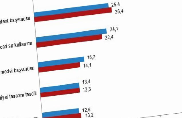 Yenilik faaliyetleri ile elde edilen rekabetçi avantajı aktif müdafaa formüllerinin de sorgulandığı araştırmada, yenilik faaliyetinde bulunan teşebbüslerin %48,3’ünün ticari marka tescili yaptırdığı tespit edildi. Bunu %26,4 ile patent başvurusu, %22,4 ile ticari sır kullanımı, %14,1 ile yararlı model başvurusu, %13,3 ile endüstriyel tasarım tescili ve %13,2 ile telif hakkı başvurusu izledi.