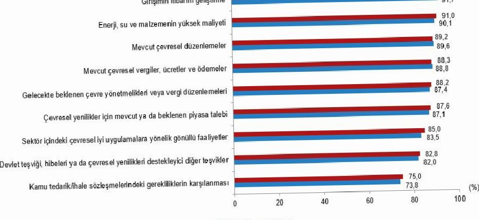Yenilik faaliyetinde bulunan ve çevresel yarar sağlayan yenilikleri uygulamaya koyan teşebbüslerin %91,7’si teşebbüsün prestijini geliştirme, %90,1’i güç, su ve materyalin yüksek maliyeti, %89,6’sı mevcut çevresel düzenlemeler, %88,8’i mevcut çevresel vergiler, fiyatlar ve ödemeler nedeniyle çevresel yarar sağlayan yenilikleri uygulamaya koyma kararının değerli olduklarını belirtti.