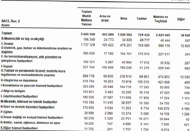 2024 yılında maddi mallara ait gayri safi yatırım harcamalarının 2 trilyon 822 milyar TL’si makine ve teçhizata, 1 trilyon 620 milyar TL’ si mevcut bina ve yapılara, 721 milyar TL’si inşaatların ve binaların büyük tadilatlarına, 443 milyar TL’si toprağa ve 39 milyar TL’si başka maddi mallara yatırım harcamaları olarak gerçekleşti.