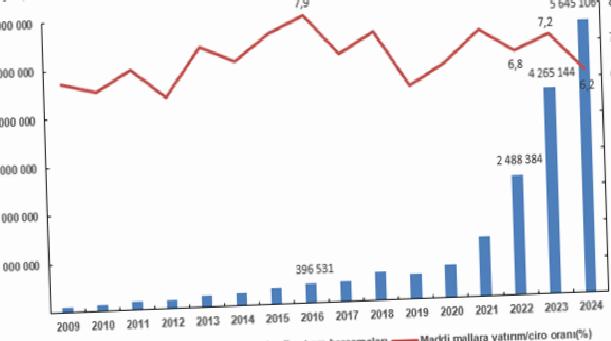 Yıllara nazaran maddi mallara ait gayri safi yatırım harcamaları toplamı ve toplam maddi mallara yatırım/ciro oranı, 2009-2024